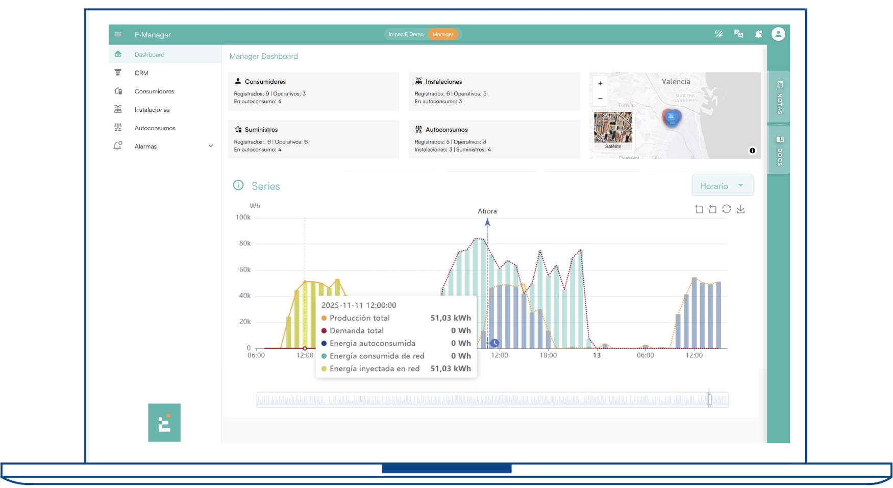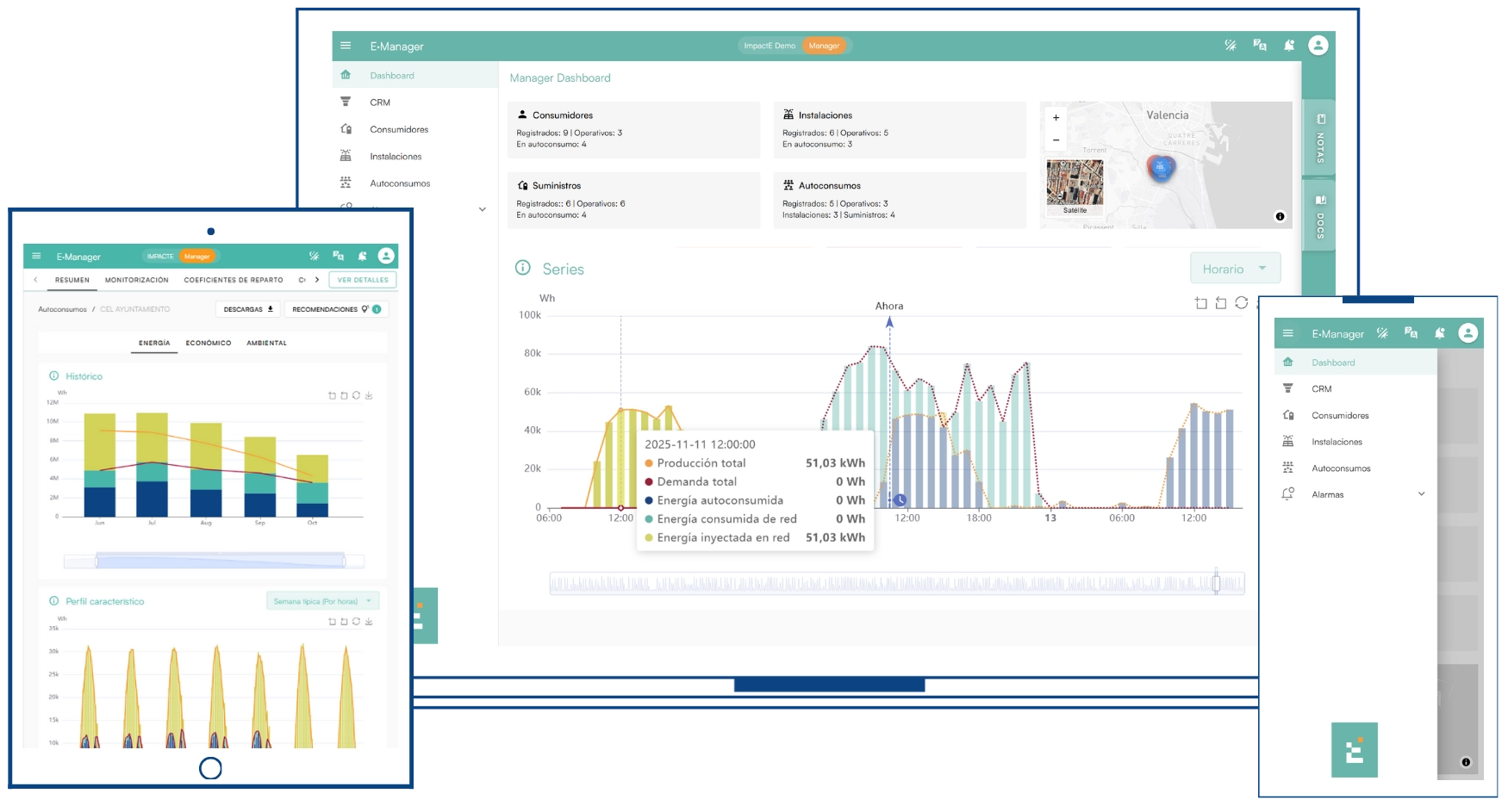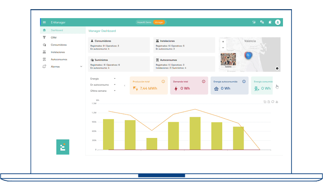 Consulta producción, consumo, autoconsumo, ahorro y alarmas. Filtra por instalación, cliente o zona para un control total.